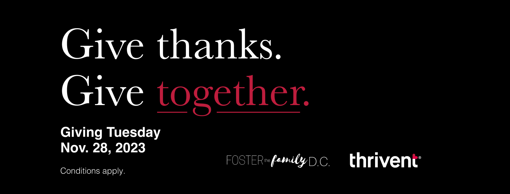 Giving Tuesday Overview (video, 00:57) Social Save the Date (video, 00:07) Social Post 1 (video, 00:06) - Give thanks. Give together.Social Post 2 (video, 00:06) - $1 for every $2.Social Post 3 (video, 00:07) - 50% of our goal.Social Post 4 (video 00:06) - Let's keep it going, together.Social Post 5 (video, 00:07) - Let's finish strong. Together.Facebook Cover Image - GenericFacebook Cover Image - Co-branded