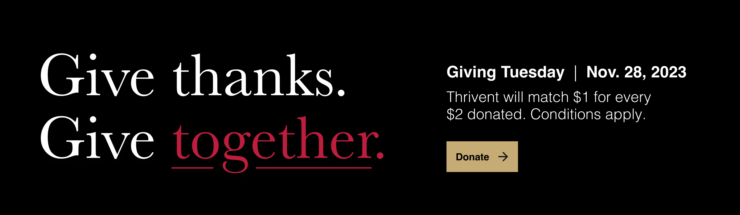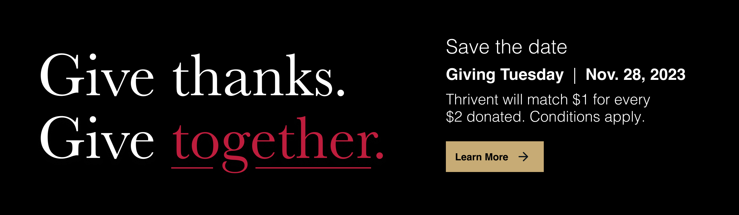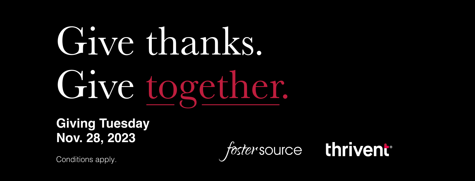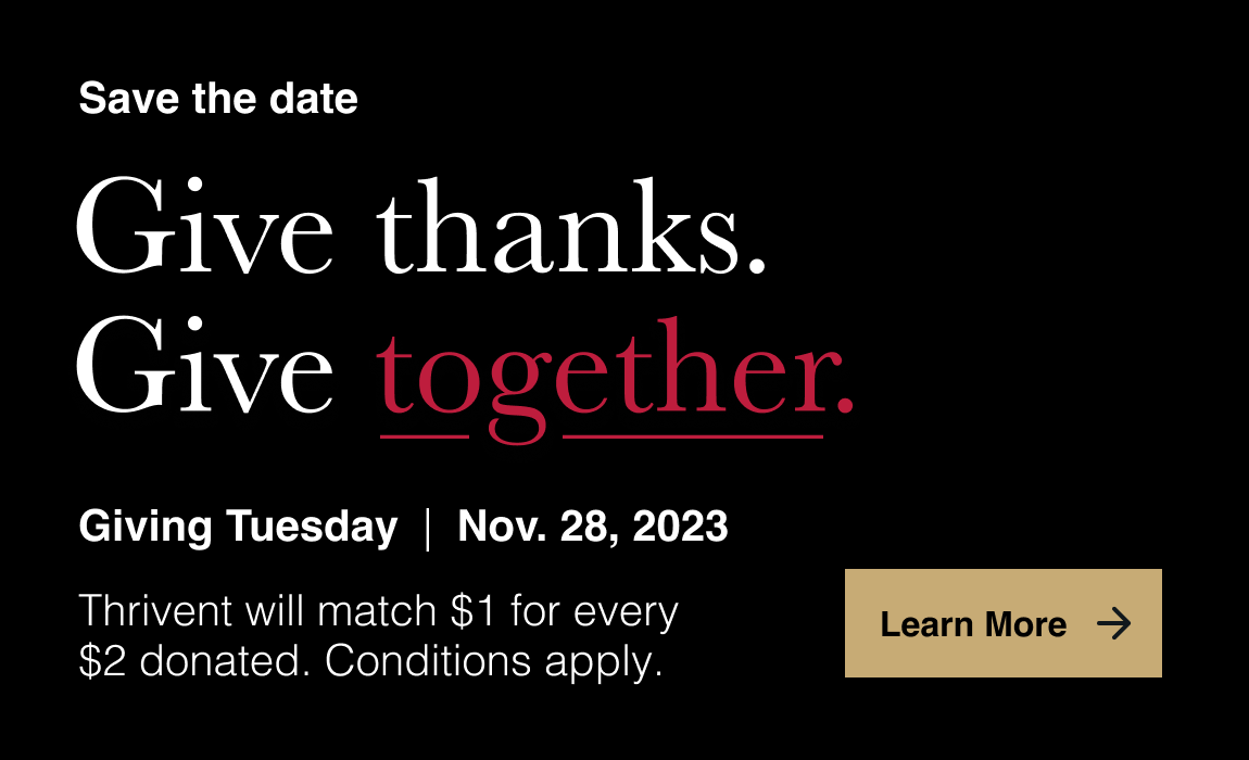 Giving Tuesday Overview (video, 00:57) Social Save the Date (video, 00:07) Social Post 1 (video, 00:06) - Give thanks. Give together.Social Post 2 (video, 00:06) - $1 for every $2.Social Post 3 (video, 00:07) - 50% of our goal.Social Post 4 (video 00:06) - Let's keep it going, together.Social Post 5 (video, 00:07) - Let's finish strong. Together.Facebook Cover Image - GenericFacebook Cover Image - Co-branded