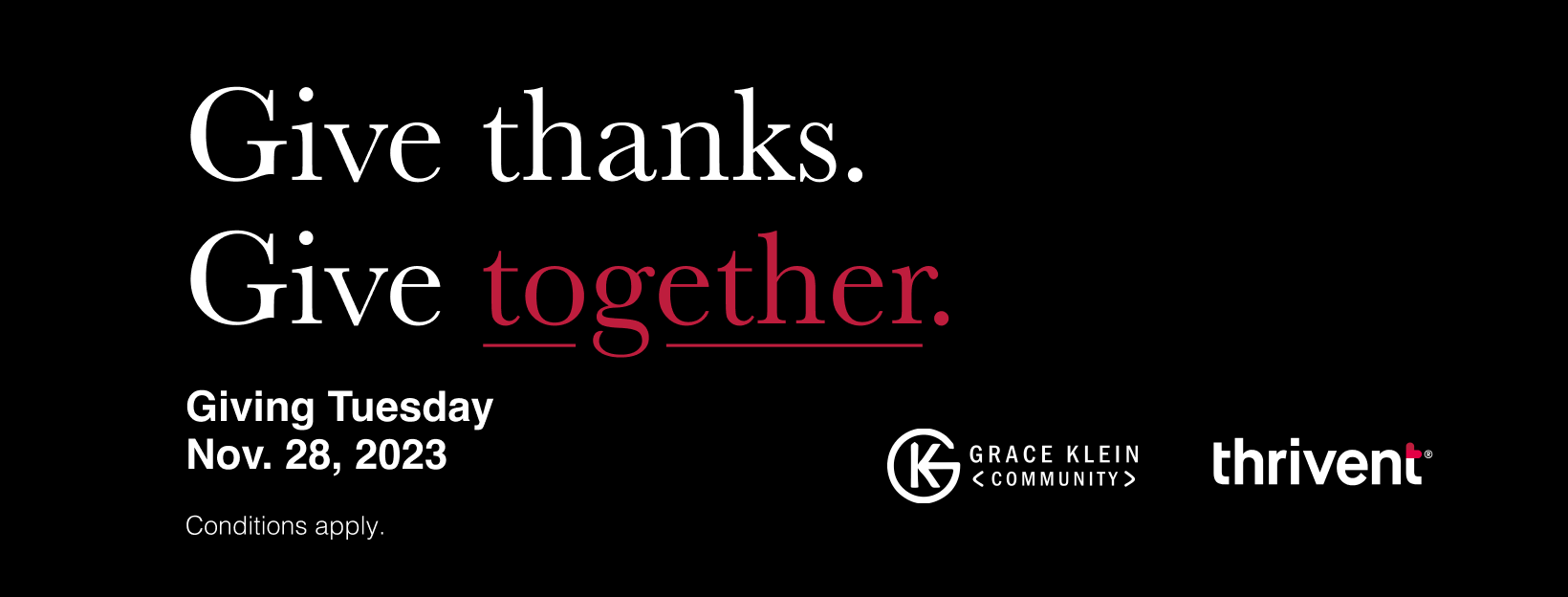Giving Tuesday Overview (video, 00:57) Social Save the Date (video, 00:07) Social Post 1 (video, 00:06) - Give thanks. Give together.Social Post 2 (video, 00:06) - $1 for every $2.Social Post 3 (video, 00:07) - 50% of our goal.Social Post 4 (video 00:06) - Let's keep it going, together.Social Post 5 (video, 00:07) - Let's finish strong. Together.Facebook Cover Image - GenericFacebook Cover Image - Co-branded