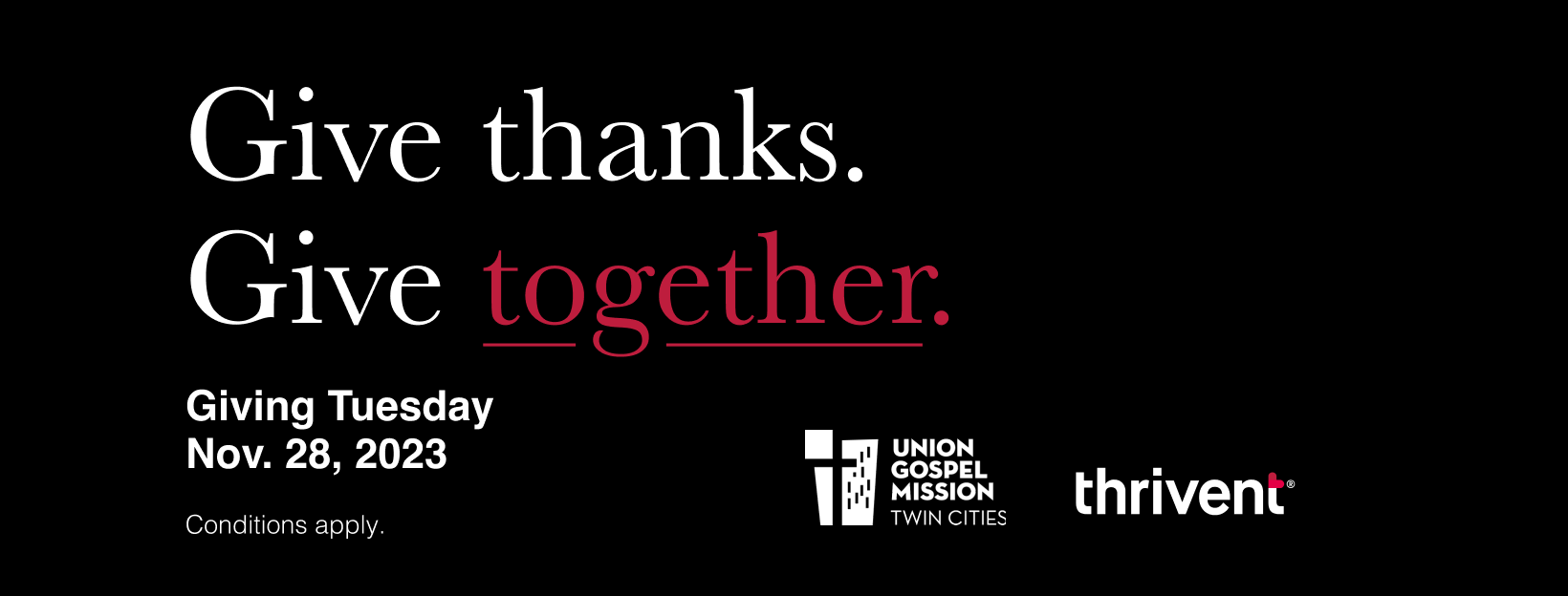 Giving Tuesday Overview (video, 00:57) Social Save the Date (video, 00:07) Social Post 1 (video, 00:06) - Give thanks. Give together.Social Post 2 (video, 00:06) - $1 for every $2.Social Post 3 (video, 00:07) - 50% of our goal.Social Post 4 (video 00:06) - Let's keep it going, together.Social Post 5 (video, 00:07) - Let's finish strong. Together.Facebook Cover Image - GenericFacebook Cover Image - Co-branded