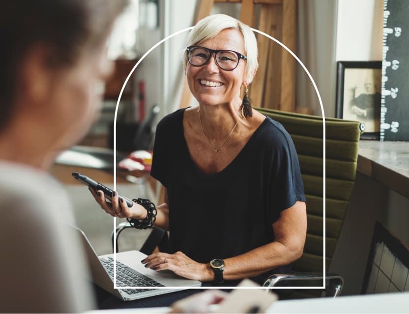 Photo of woman on phone and laptop surrounded by arch illustration
